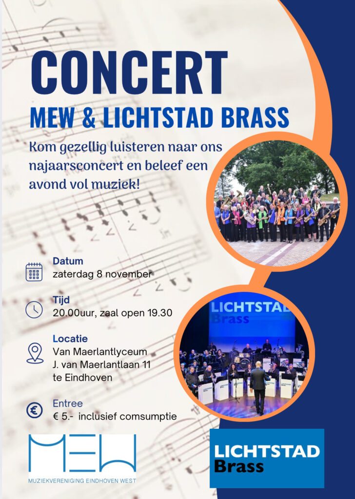 Op zaterdag 8 houden wij ons najaarsconcert samen met brassband 'Lichtstad Brass'. We zijn al weer hard aan het repeteren om er een gezellige muzikale avond van te maken met oude bekende nummers maar ook nieuwe nummers. Onze activiteitencommissie heeft een mooie locatie gevonden namelijk het vernieuwde van Maerlantlyceum te Eindhoven. Het concert begint om 20.00uur en de zaal gaat open vanaf 19.30uur, Entree is € 5.- inclusief consumptie.Samenvatting